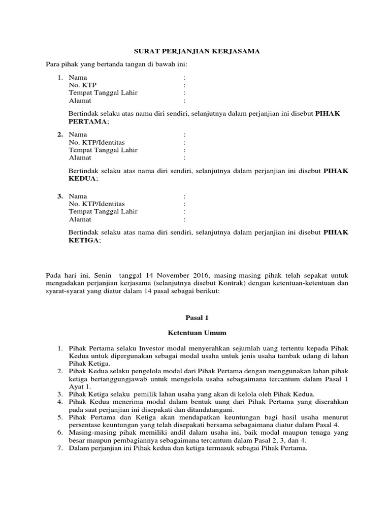 Untuk kerjasama perorangan, maka bisa menggunakan contoh surat perjanjian kerjasama usaha, baik kerjasama usaha 2 10. Contoh surat perjanjian kerjasama jasa di atas dibuat menggunakan format yang baik dan benar. Ada berbagai jenis surat perjanjian kerjasama yang dapat kamu buat, mulai dari kerjasama dagang, usaha, jasa, proyek, hingga investasi. Cara buat surat izin tidak masuk sekolah; Surat perjanjian kerjasama usaha komoditas tomat nomor: Contoh surat perjanjian kerjasama dagang Contoh surat perjanjian kerjasama usaha perorangan usaha perorangan adalah usaha yang dilakukan secara individu dan tidak melibatkan orang lain dalam melakukan usaha. Budidaya burung doc contoh surat perjanjian kerjasama download budidaya burung doc contoh surat perjanjian kerjasama download format surat lain: Contoh surat pernyataan kepemilikan harta tax amnesty; 11 contoh surat perjanjian singkat hutang kerja. Doc contoh surat perjanjian proyek desain interior. Contoh surat perjanjian kerjasama usaha. Pasal 1 ketentuan umum 1.